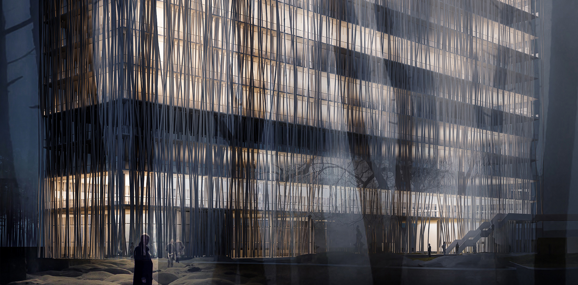 Lo sviluppo in altezza, la semplicità volumetrica e la riduzione al minimo possibile della manica, capace comunque di garantire la massima efficienza e flessibilità della pianta tipo, spingono ad un ruolo fondamentale le facciate dell’edificio, che non sono semplicemente una “pelle” superficiale filtrante, ma l’elemento attivo di “trasformazione” e vita attiva dell’edificio come corpo fisico dialogante con la natura e l’insieme del Campus. L’idea di strutturare tutto l’edificio attraverso la creazione di “liane” in calcestruzzo che lo “fasciano” su tutti lati, differenziando la loro frequenza e deformazione, permettono da una parte di filtrare la luce del sole in
